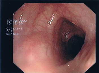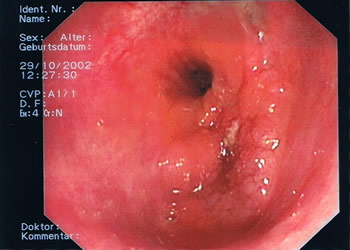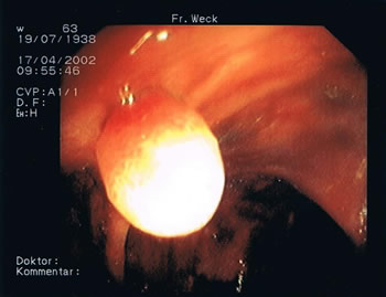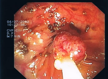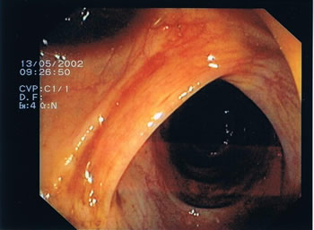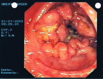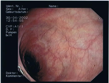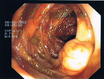 Endoskopische Bilder. Das Darmlumen innerhalb der einzelnen Darmabschnitte kann eher rundlich, leicht eingeengt oder dreieckförmig aussehen, entsprechend des anatomischen Aufbaus (s. Abb.1-4). Grundsätzlich gibt es verschiedene Arten von Polypen mit unterschiedlichen Konfigurationen und von verschiedener Größe. Kugelig(Abb.6) mit schmaler Verbindung zur Darmwand, hügelig mit breiter Basis, muschelförmig, die sich häufig an eine Querfalte anschmiegen, gestielte Polypen, die über einen Stiel mit der Darmwand verwachsen sind und sessile Polypen (Abb.5), die breitbasig auf der Darmwand aufsitzen. Der Übergang zum Dünndarm (Ileocaecal-Klappe) kann des Öfteren ein polypöses Aussehen vortäuschen (Abb.4).